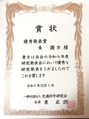Assistant Professor Yuanfang Zhu Received the Excellent Presentation Award at the 2025 Annual Research Meeting of the Traffic Science Society.